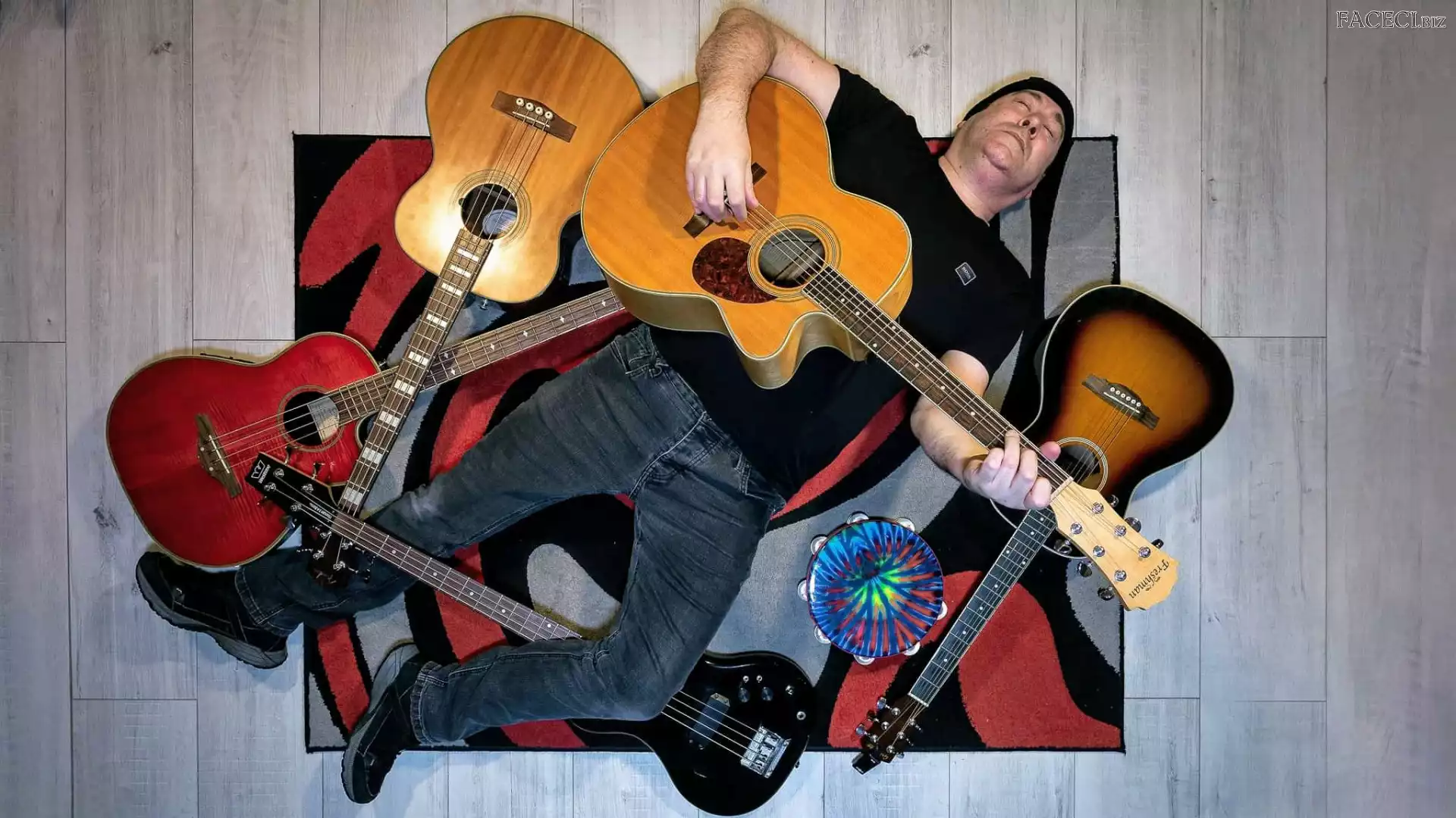 Mężczyzna, Leżący, Muzyka, Gitary, Dywan - faceci.biz